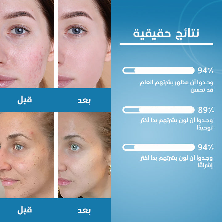 أفاد 100% من المستخدمين بحصولهم على لون بشرة أكثر إشراقًا وتوحيدًا خلال أسبوعين فقط من الاستخدام، مما أظهر تحسنًا ملحوظًا في لون بشرتهم.